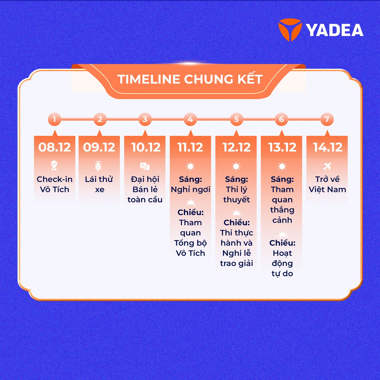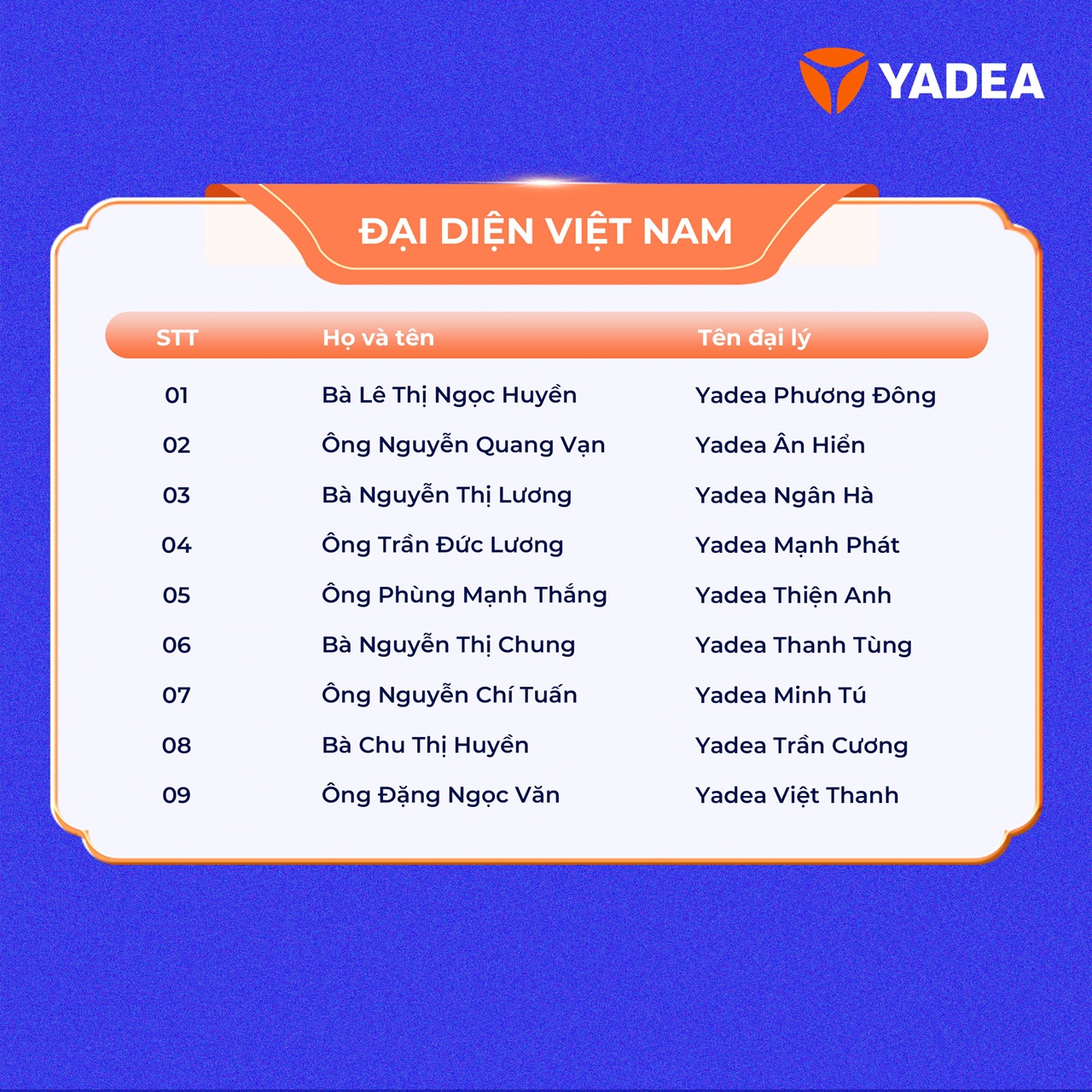 Yadea Việt Nam vinh dự có 09 thí sinh xuất sắc góp mặt tại Vòng Chung kết Toàn cầu, sẵn sàng tranh tài, bứt phá và khẳng định vị thế trên sân chơi quốc tế. Các thí sinh đều là những nhân sự nổi bật, có thành tích ấn tượng trong hoạt động bán hàng và chăm sóc khách hàng tại thị trường Việt Nam.