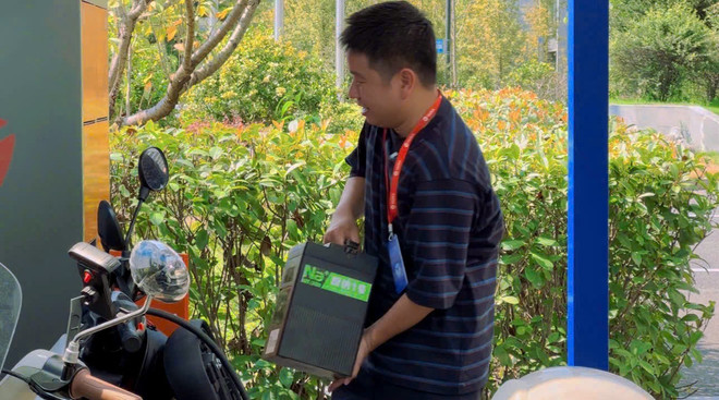 Khách hàng của Yadea thao tác quá trình thay Pin tại trạm thay tự động.