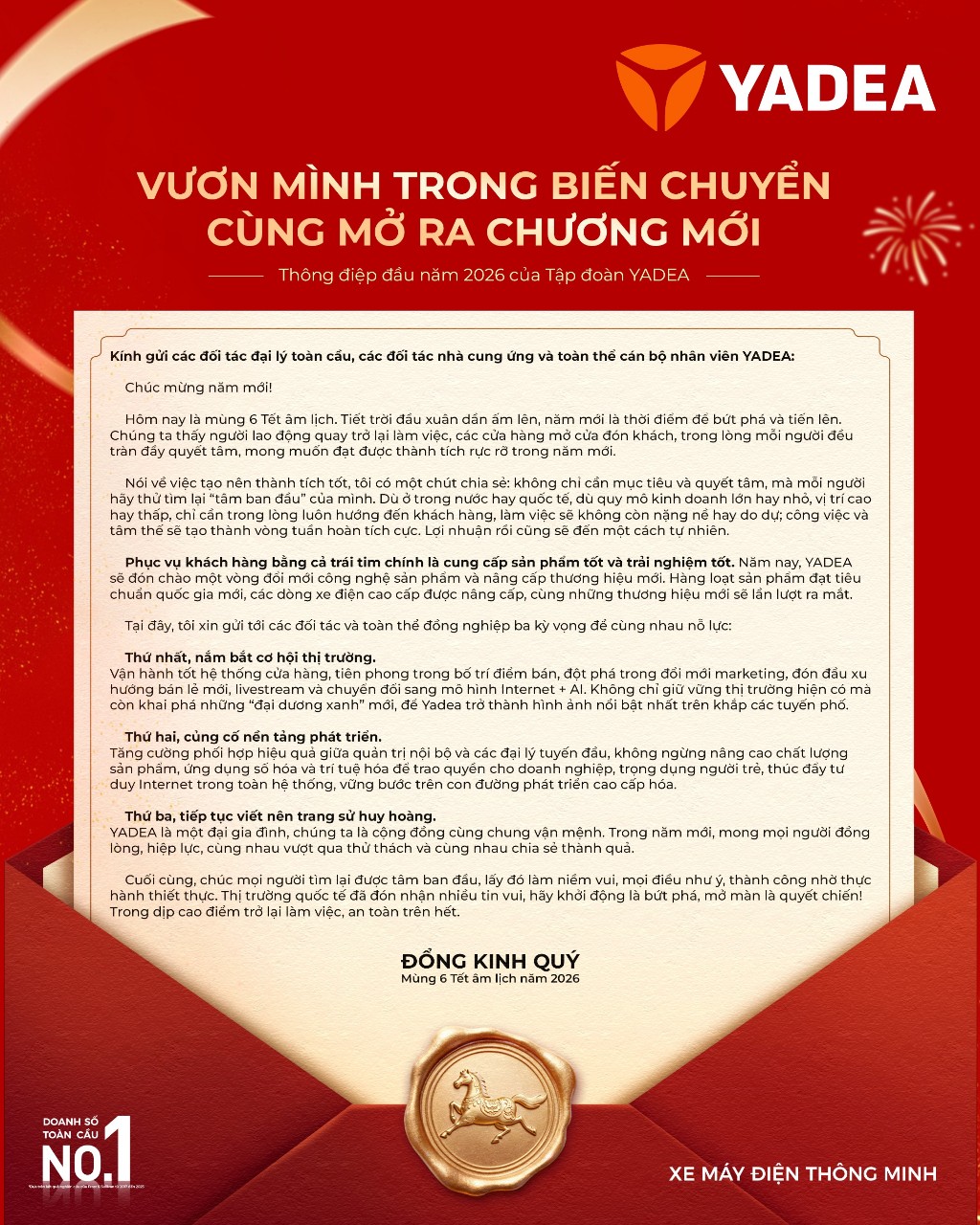 Bước sang năm mới 2026, Chủ tịch Tập đoàn Yadea trân trọng gửi lời chúc mừng năm mới đến Quý khách hàng, Quý đối tác và toàn thể CBNV trên toàn hệ thống. Sự tin tưởng, đồng hành và nỗ lực không ngừng của tất cả đã tạo nên nền tảng vững chắc để Yadea tiếp tục khẳng định vị thế thương hiệu xe điện hàng đầu trên thị trường toàn cầu.